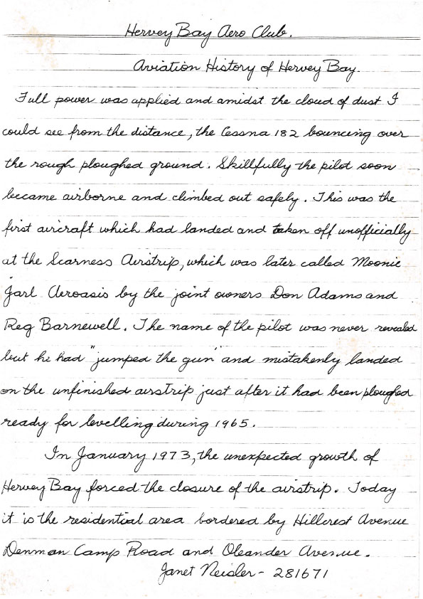 Full power was applied and amidst a cloud of dust I could see from a distance, the Cessna 182 bouncing over the rough ploughed ground…… The story of the first aircraft to land and take off from the original Hervey Bay Airport in Scarness.