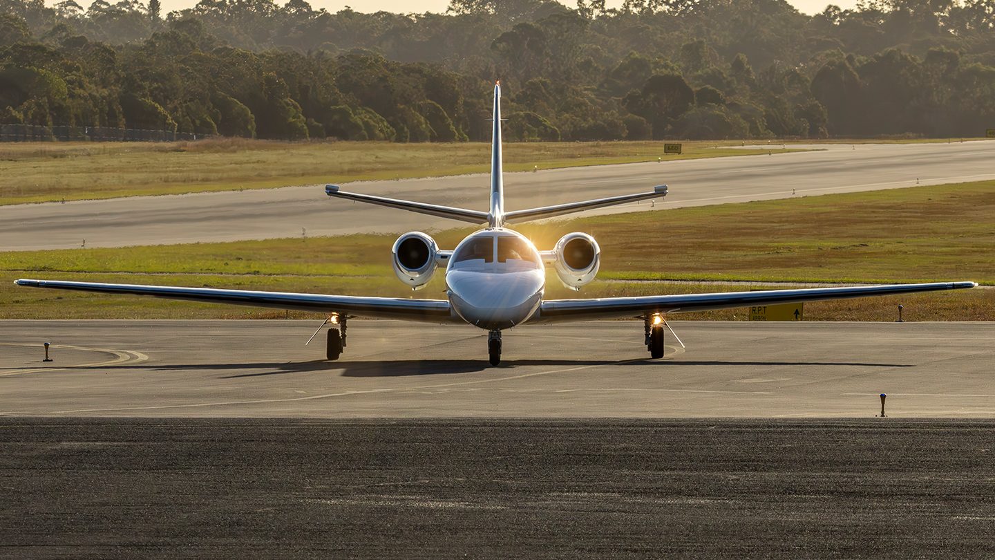 14/07/2023: Essendon Aviation Service’s little rocket ship aka the Cessna S550 Citation S/II | VH-SQM dropped into Hervey Bay for a nav stop this afternoon. Pic by Alex Eecen.
